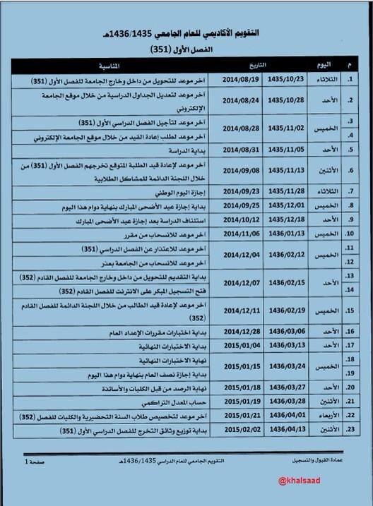 التقويم الأكاديمي للعام الجامعي 1436/1435 الفصل الأول لجامعة القصيم
