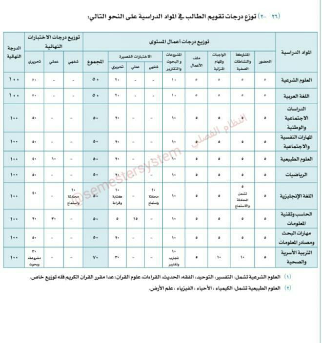 تحميل توزيع درجات مواد النظام الفصلي الجديد حسب المواد الدراسية