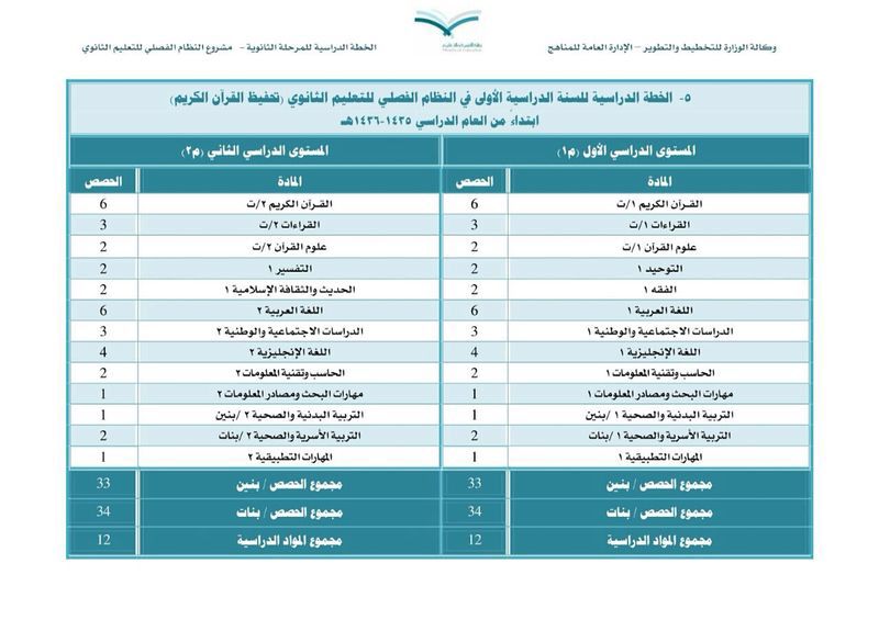 تحميل الخطة الدراسية للسنة الدراسية الأولى ( تحفيظ القرآن الكريم ) النظام الفصلي 1435 - 1436