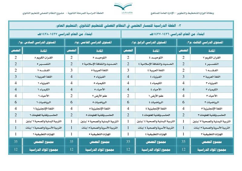 الخطة الدراسية للمسار العلمي في النظام الفصلي 1436 - 1437 / 1437 -1438