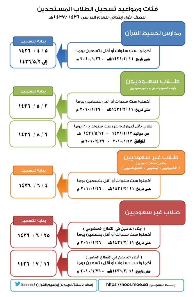 فـئـات ومواعيد تسجيل الطلاب المستجدين للصف الأول الابتدائي لعام 1436 / 1437هـ