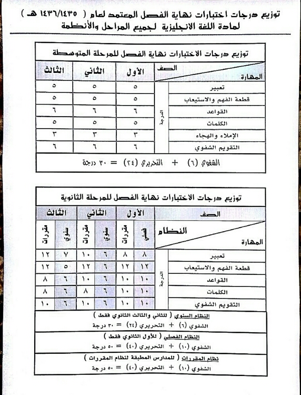 تحميل توزيع درجات مادة اللغة الأنجليزية حسب جدول المواصفات المعتمد لعام ١٤٣٦هـ