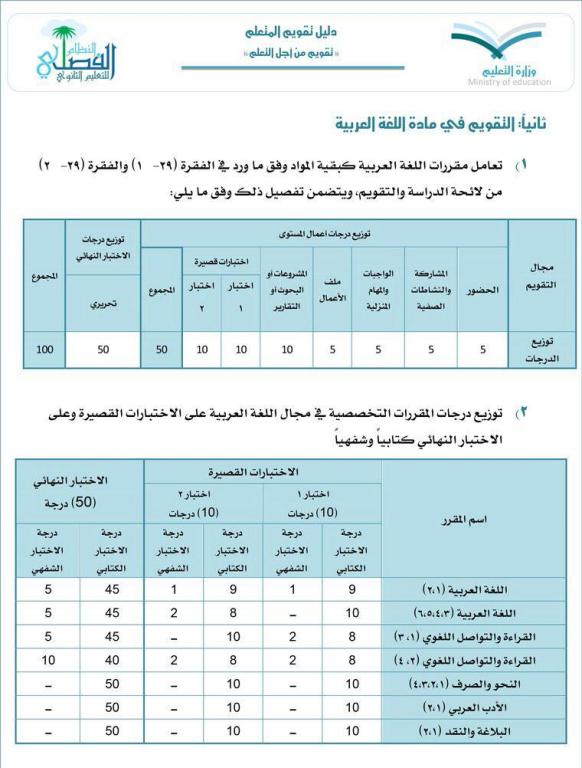 تقسيم درجات مواد اللغة العربية للنظام الفصلي بعد التعديل الجديد 1437هـ