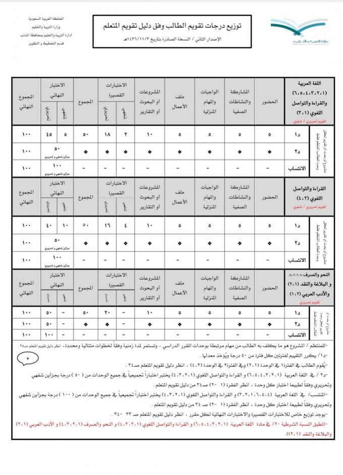 تحميل توزيع درجات مادة اللغة العربية للصف الثاني ثانوي النظام الفصلي المستوى الثالث 1437هـ