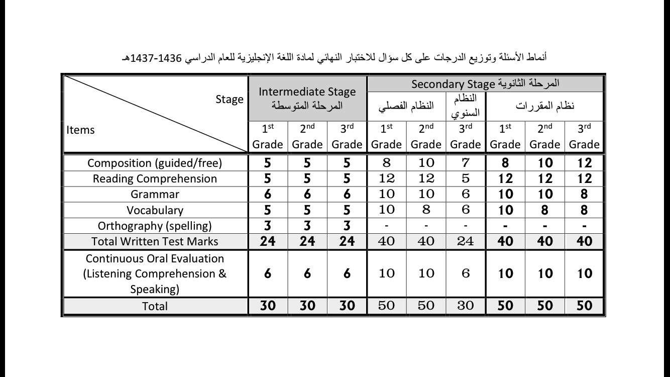 تحميل توزيع الدرجات للمرحلة الثانوية فصلي لمادة اللغة الأنجليزية 1437هـ